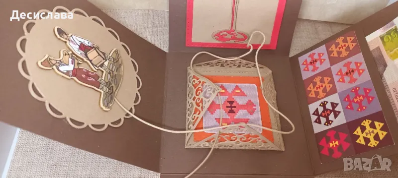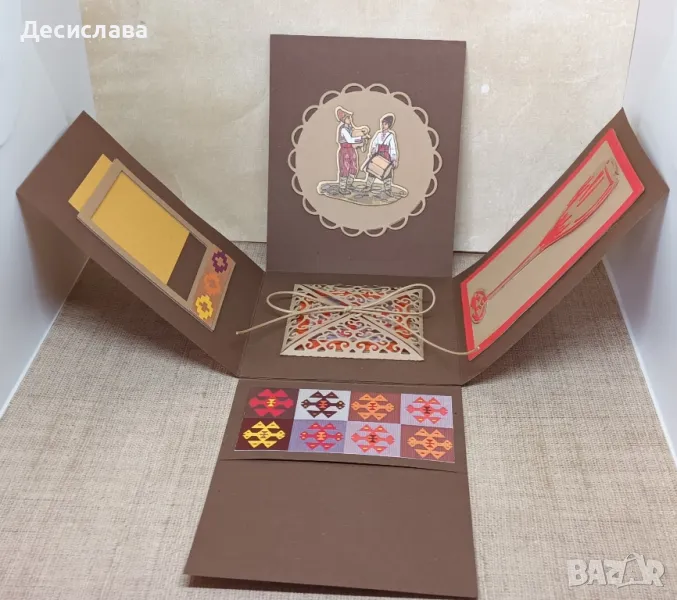 Екплоадираща кутия в ЕТНО стил със свободно падащи стени и предвидено място за паричен подарък или ваучер + рамка за снимка или пожелания.