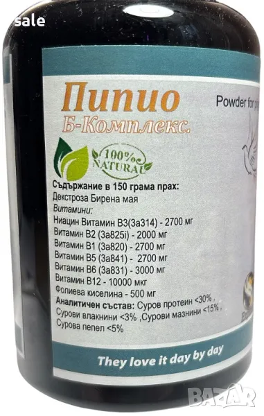 Като добавка продукта Pipio Б-Комплекс,150 гр. прах за гълъби е предназначен да обепечава физиологичната потребност на Б витамините при гълъбите. Подпомага нормалното функциониране на нервната система.