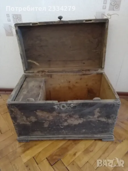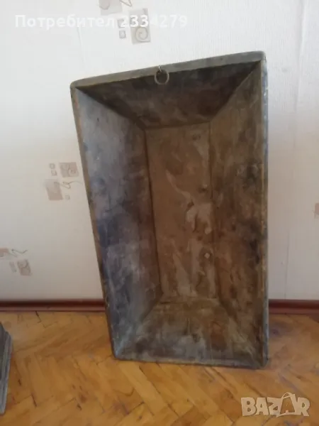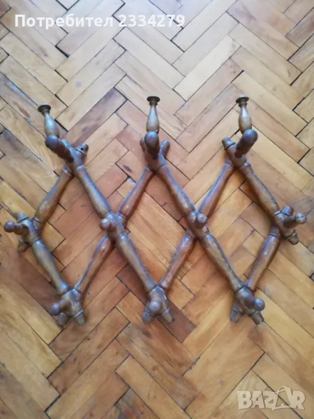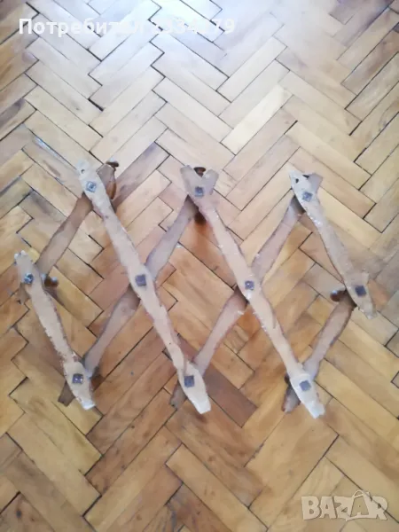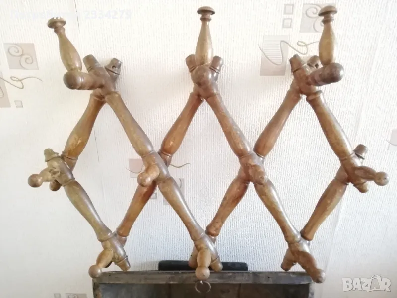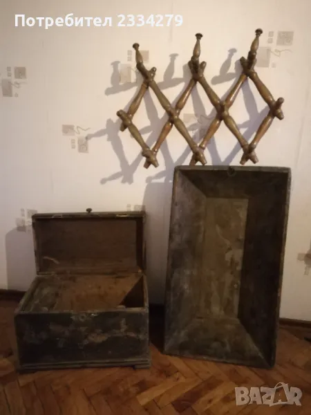 Дървена разтегателна закачалка, ръчно изработена през 40-50те години, цена 35лв. N:2 Старо дървено корито-нощва много добре запазено, използвано за месене на хляб, месо и други домакинства. Размери: дължина 80х45см.,дълбочина 20см., цена 40лв. Перфектни декорации и ползване за битова къща, градина, механа, витрина.; N:3 Стара малка дървена ракла, сандък използвана за дрехи, накити, книжа и други, също и при пътуване или на войник в казарма и война, цена 50лв.