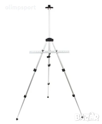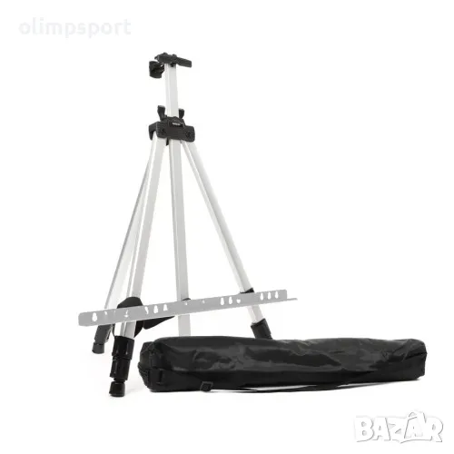 Метален статив за рисуване тип триножник, сгъваем и преносим. Подходящ за използване на закрито и открито, както и върху всякакви повърхности, включително и като настолен в максимално сгънато състояние. Краката му са телескопични, снабдени с противоплъзгащи тапи. Може да се използва и като декорация за поставка на картини. Има удобна транспортна чанта, в която да се съхранява, когато не се изплозва или да се пренася удобно в сгънато състояние. В разгънато положение заема площ с размер на 85х43 см. Регулируема височина от 40 до 165 см. Минимална Височина 40 см. със заемана площ от 37х37 см. Комплектът съдържа 1 брой триножник, 1 брой хоризонтална лента, 1 брой транспортна чанта в черен цвят.