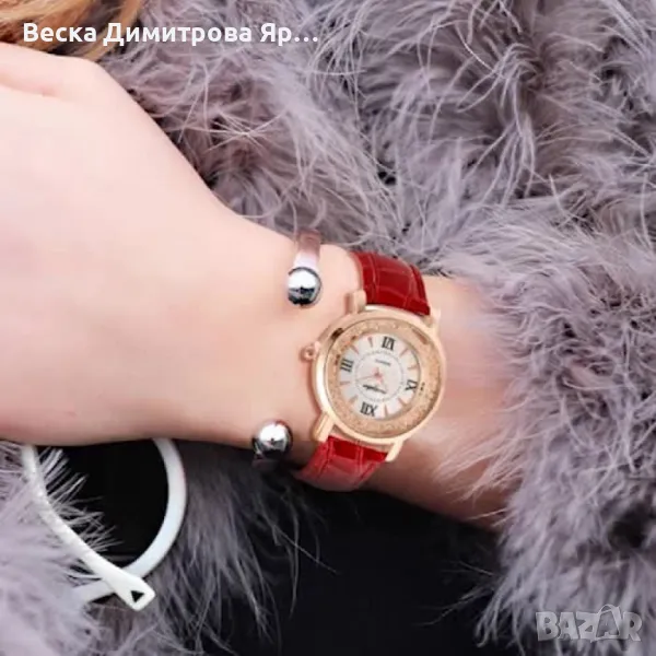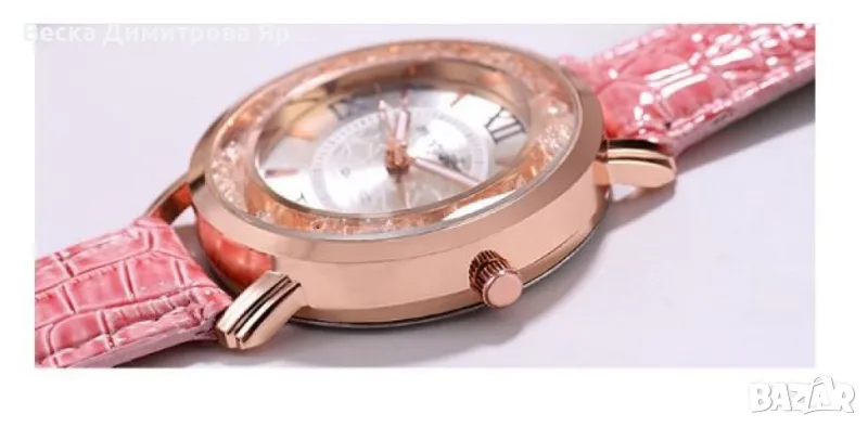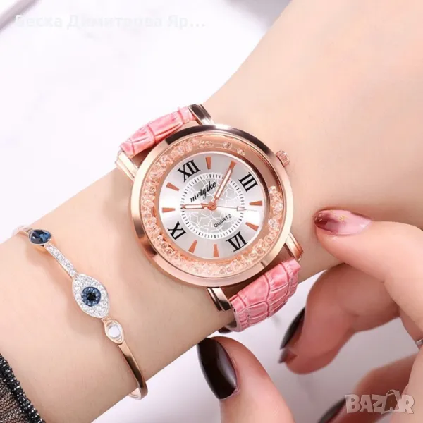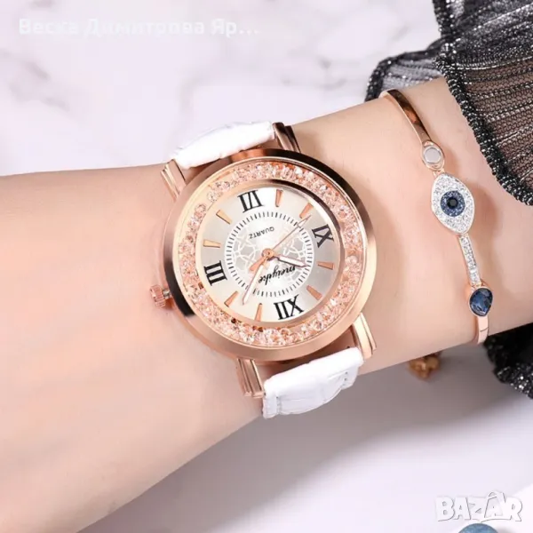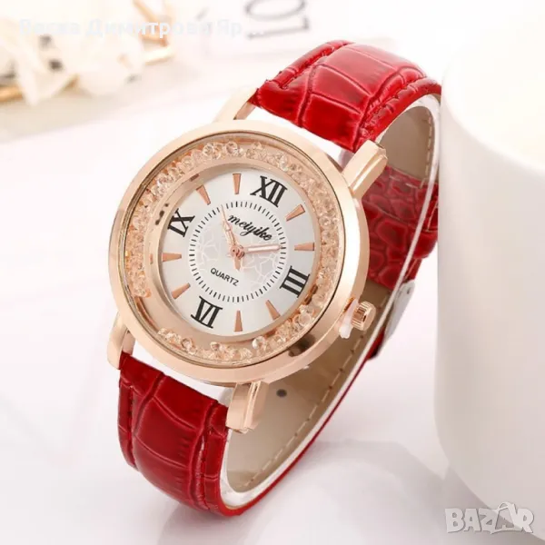 Дамски ръчен часовник с кръгъл циферблат с камъни и кожена каишка. → Обява 47825487