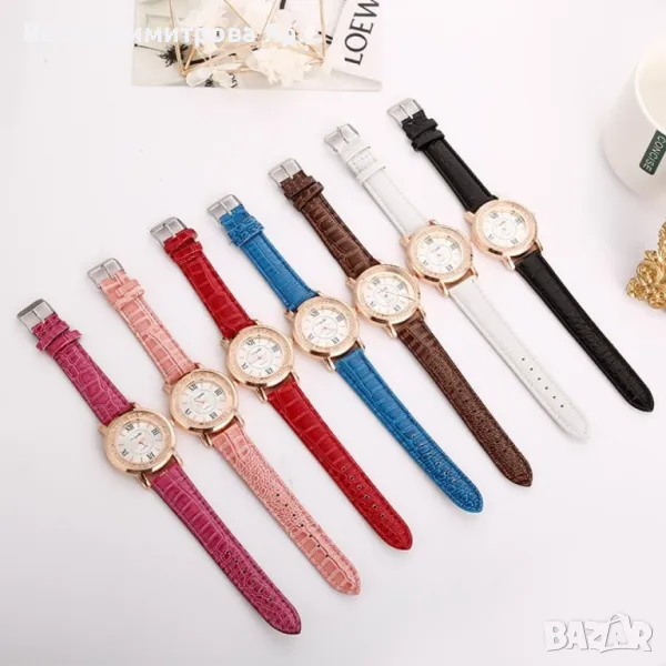 Дамски ръчен часовник с кръгъл циферблат с камъни и кожена каишка. бял, червен, лилав, син, черен, розов и кафяв