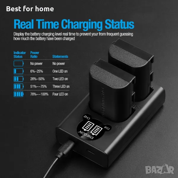 【Множество опции за зареждане】 Двойното USB с LCD зарядно устройство предоставя 2 порта за зареждане за захранване на вашата батерия canon LP-E6/E6N, единият е Micro-USB порт, а другият е порт Type-C. И двата порта могат да бъдат свързани с всеки кабел с 5V USB източник като компютър, зарядно за кола или захранваща банка и т.н. за допълнителна опция за зареждане.