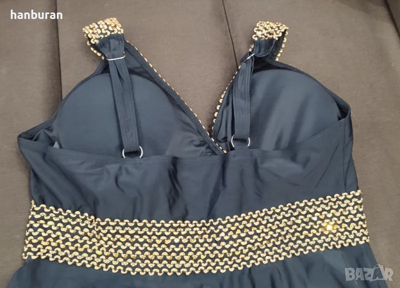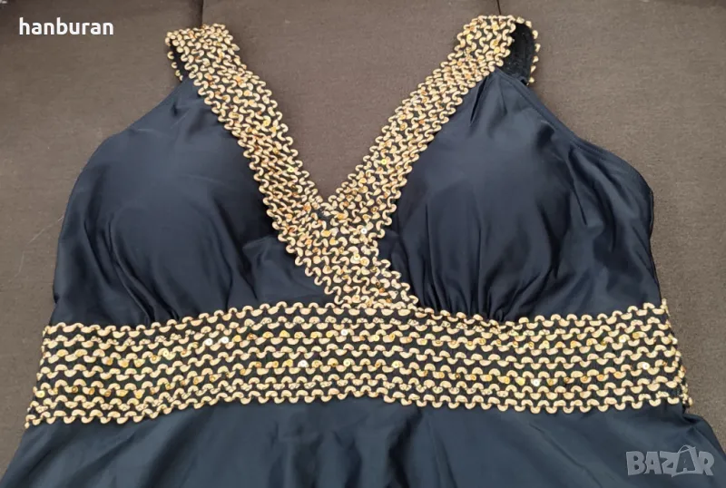 Страхотен черен бански със златна лента. Чисто нов. Размер XL. Стои много добре. За съжаление за пореден път съм сгрешила размера.