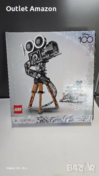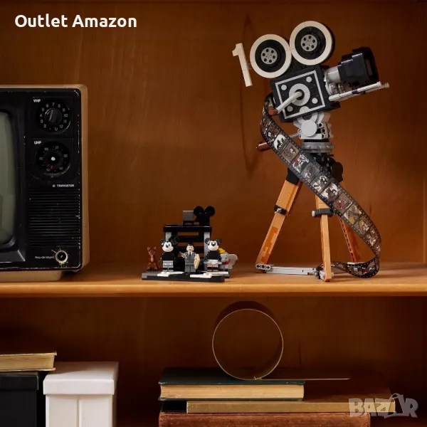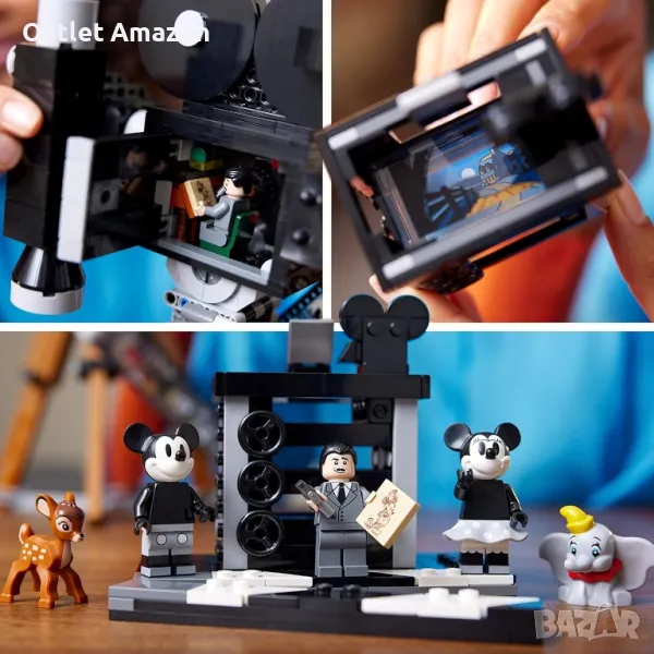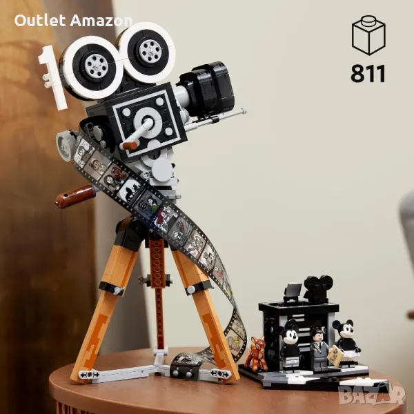 Конструкторът на LEGO чества 100-годишнината на Disney. Той се състои от 811 части, от които може да се сглоби почетна камера с филмова лента и режисьорска клапа. Камерата е в ретро стил и може да се отваря. Тя има заден панел с панти, който разкрива помещение. В него може да се разположи мини фигурка. Матовата кутията на камерата се плъзга и открива своите лещи. Ръчката, отстрани на камерата, може да се върти. На филмовата лента са илюстрирани картинки от 20 филма. В кутията са включени 5 мини фигурки на Уолт Дисни, Мики Маус, Мини Маус, Бамби и Дъмбо. Върху режисьорската клапа могат да се разположат фигурките и многопланова камера. Тя има 3 илюстрации, които показват как е направен филма "Старата мелница". Инструкциите за сглобяване са включени в комплекта. Може да ги откриете и в приложението LEGO Builder за iOS и Android. Развийте своето въображение и се забавлявайте с любимите си герои.