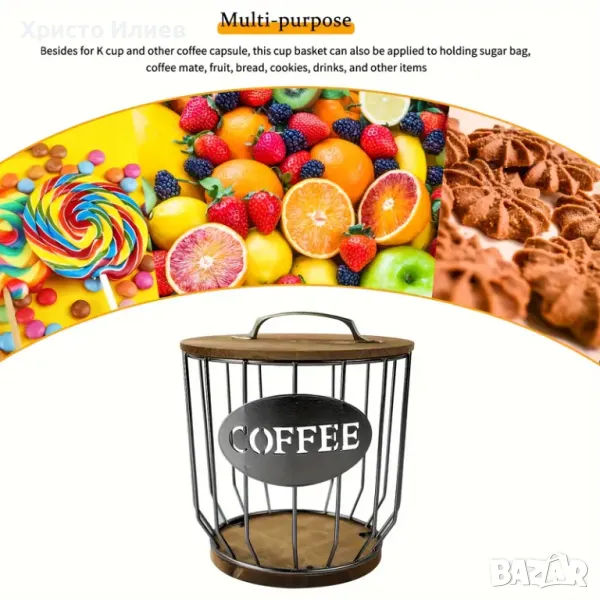 Съхранение Wire Kup може да се използва не само за съхранение на кафе капсули, бонбони, бисквитки, хляб, плодове и зеленчуци, но също така може да съхранява кухненски прибори и в същото време можете също да подредите някои цветя, за добавете свежа нотка към вашето семейство.