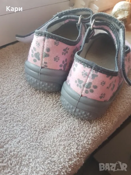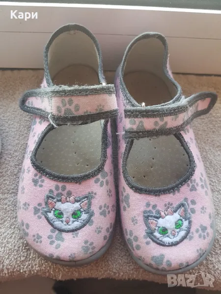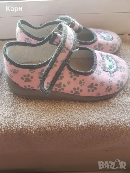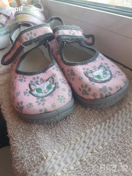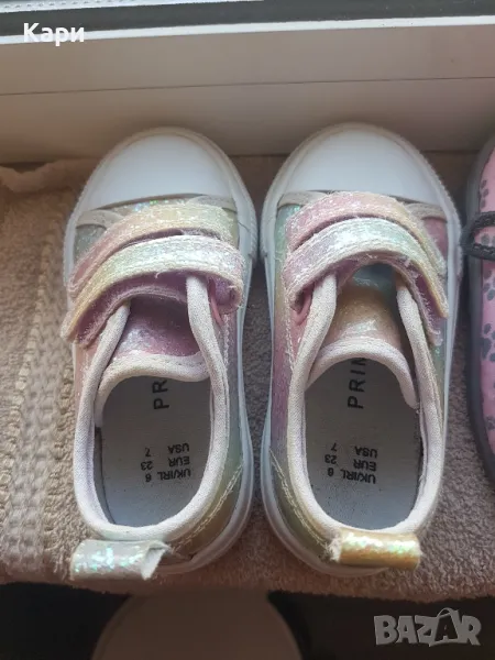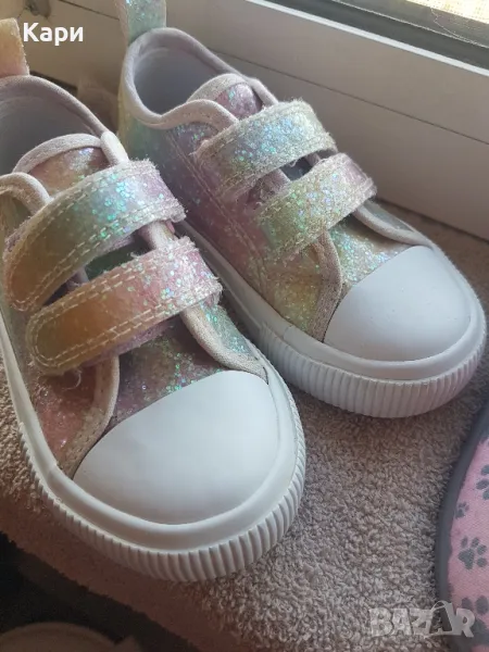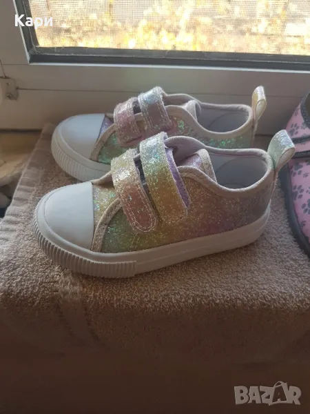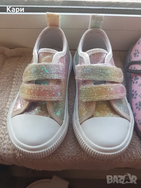 Отлично състояние,изпрани и чисти,без забележки,здрави удобни,кецове с преливащи цветове и лъскави,бяла подметка на primark,и пантофи розови с коте и сива подметка ,отпред има 3,4мм сцепено на едната вижда се на снимката,но не се забелязва при носене нито пък пречи.