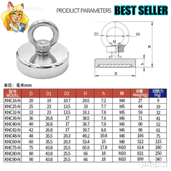 Диаметрите на този тип магнит за риболов са 20/25/32/36/42 мм, а основата е с мощен