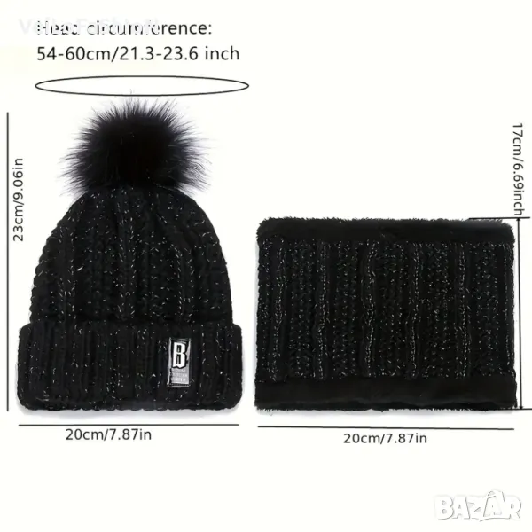дамски комплект зимна шапка с помпон и шал (яка), топла и пухкава в