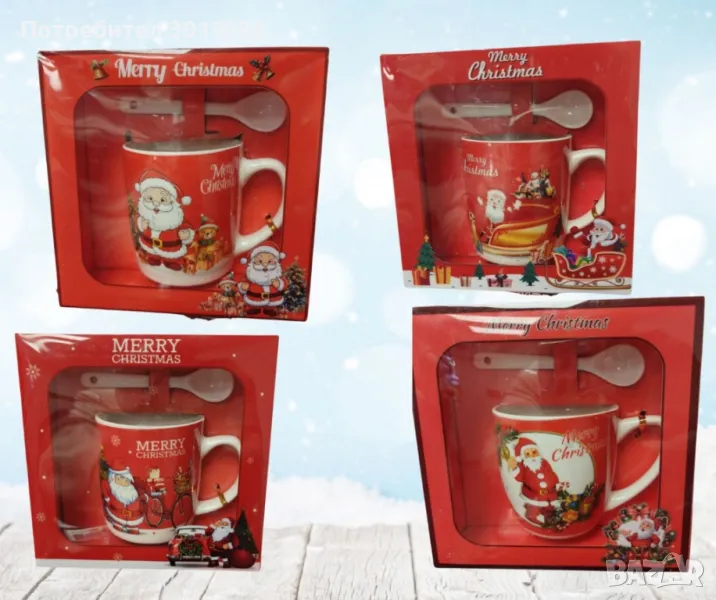 Чашата е декорирана с апликация на Дядо Коледа, като има четири различни варианта на дизайна.