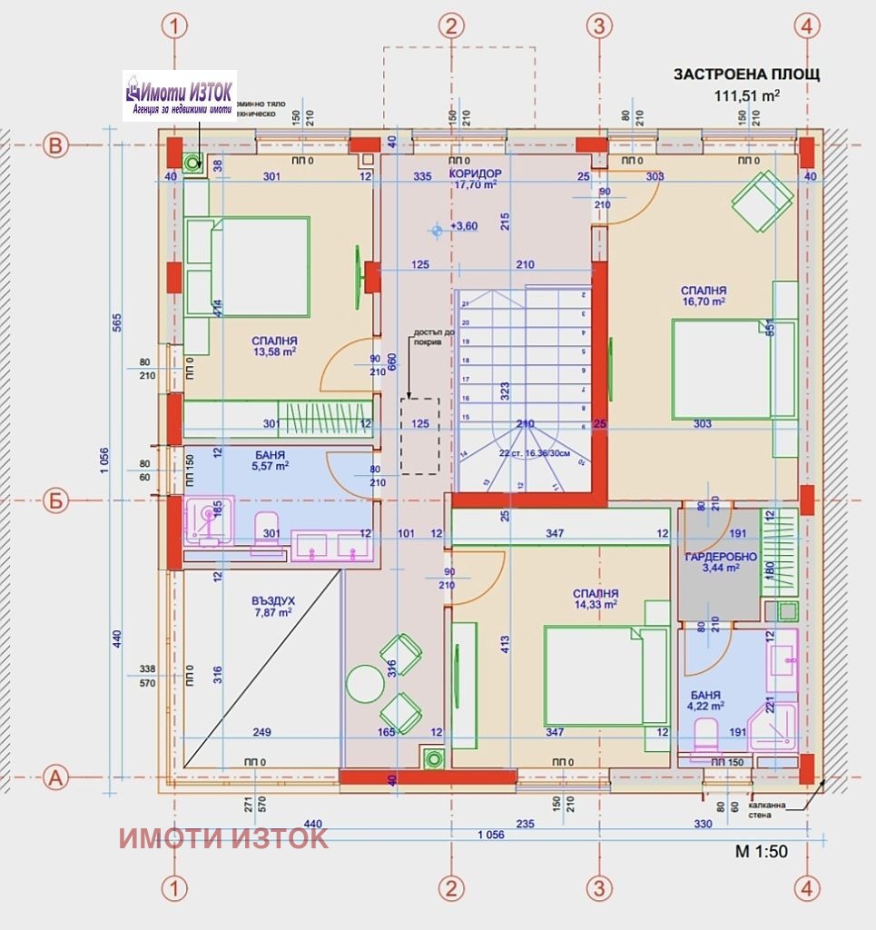 На вторият етаж са разположени три спални, две бани и гардеробна, със ЗП от 111,51кв.м.