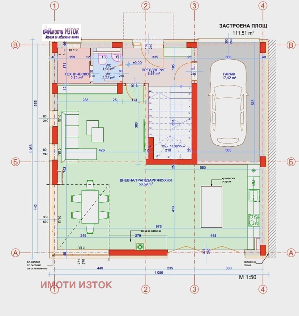 На първият етаж са ситуирани кухня, всекидневна и трапезария, , с площ от 56,59 кв.м ; предверие , техническо помещение и гараж, с площ от 17,42кв.м. ЗП на първият етаж е 111,51кв.м.