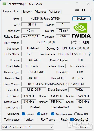 Model: NVidia GeForce Palit GT520