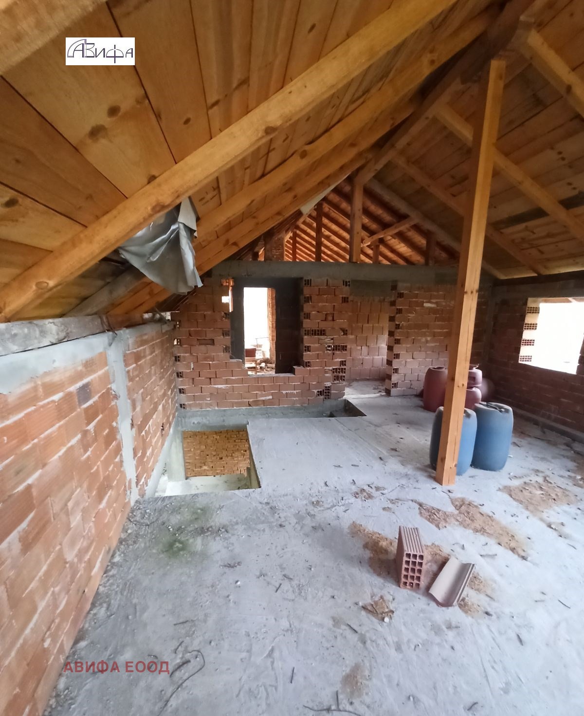 Сградата е площ от 117кв.м.,на приземният етаж са разположени кухненски бокс, стая, зимник, баня с тоалетна, второ ниво две стаи и голям коридор, трето е в строеж. Сградата е със започната пристройка. За основната част има строителна документация от 1981г. В имота има ток , изгребна яма , а водозахранването е от собствен водоизточник с целогодишен достъп.