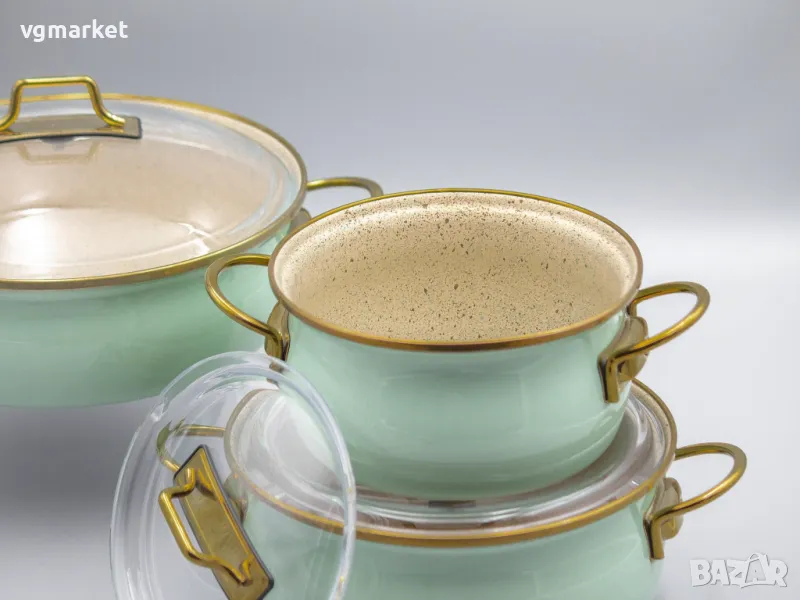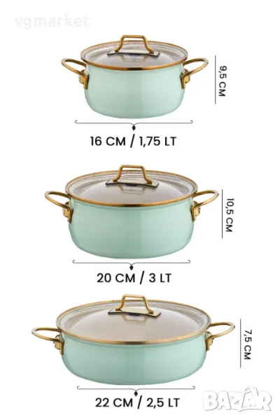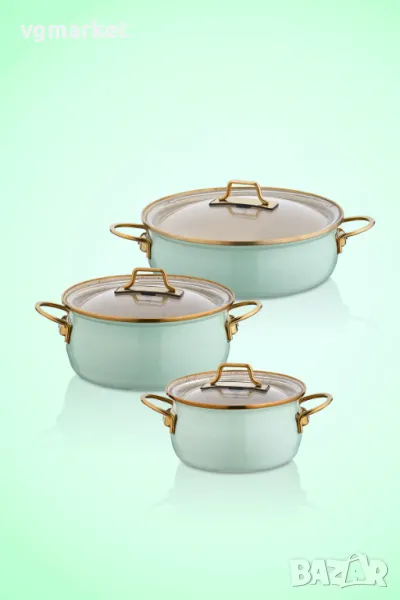 Комплект от три емайлирани тенджери BONERA Vintage с капак. Този стилен комплект емайлирани тенджери на BONERA предлага всичко необходимо за разнообразно готвене в дома. Включва 3 тенджери с различен размер всяка снабдена със стъклен капак и удобни метални дръжки за безопасно захващне. Комплектът е с ментов цвят, който ще внесе топлина и модерен акцент в кухнята на всяка домакиня.Комплектът е съвместим с всички видове котлони