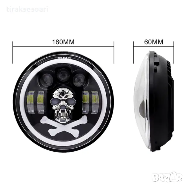 Комплект от 2бр. универсален 7" инча 18см ЛЕД LED фар халоген 12V-24V къси/дълги с DRL дневни светлини мигач бяло-жълто и череп с RGB подсветка с 6 различни цвята за АТВ джип мотоциклет камион трактор и др.
