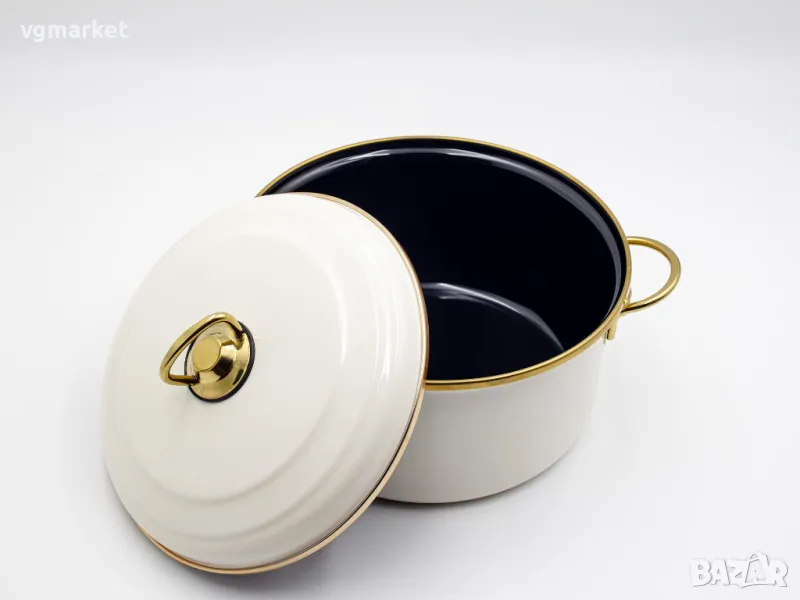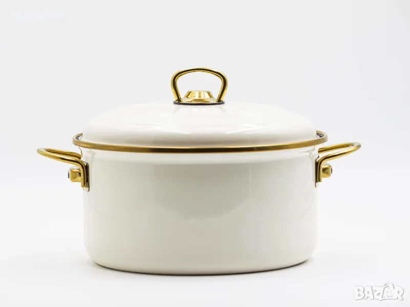 Тази изключително красива и удобна за приготвяне на ястия тенджера ще бъде незаменим помощник на всяка домакиня. Емайлираното покритие я прави устойчива на корозия и лесна за почистване. Тенджерата е с емайлиран капак със златист ръб и удобна метална дръжка. Двете златисти дръжки улесняват преместването и носенето на тенджерата. Тази красива тенджера е подходяща както за готвене , така и за сервиране на ястия, добавяйки елегантност и стил на вашата кухня.