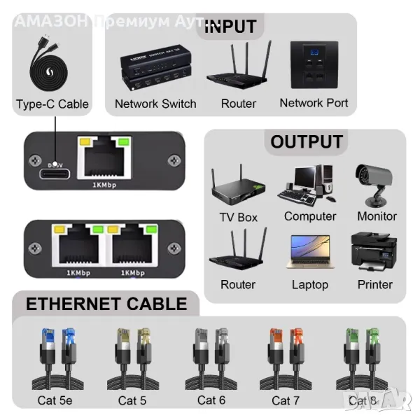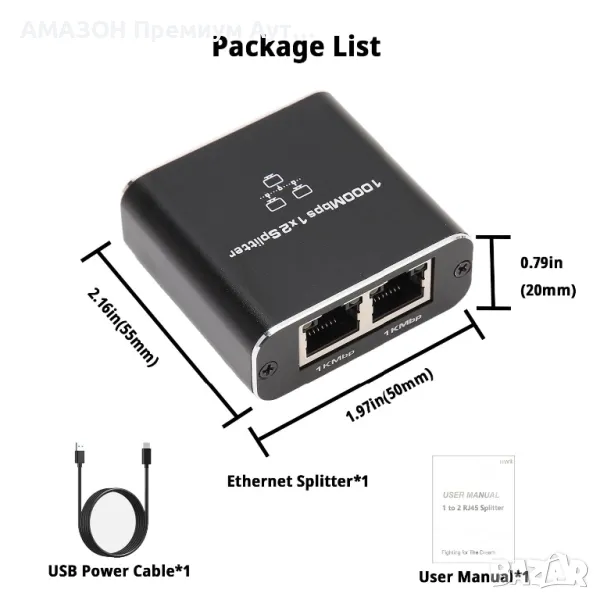 - Ethernet сплитер: Този Gigabit Ethernet сплитер е проектиран да решава проблеми с връзката, причинени от недостатъчно окабеляване. Захранван от включения USB 1 м кабел, той поддържа два компютъра за споделяне на Ethernet линия едновременно. Това е прост и ефективен мрежов сплитер, който ви помага да разширите мрежовите си портове