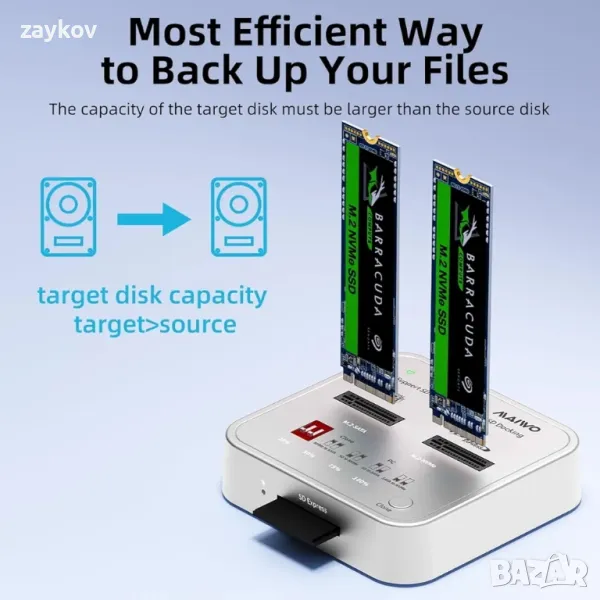 NVMe и SATA SSD, което позволява ефективен трансфер на данни и архивиране. Поддържа четене и запис за NVMe и SATA SSD едновременно, съвместим с NVMe M-Key/B&M-Key/SATA B-Key, поддържа четене на SD карта от версия 7.1 и по-ранна версия