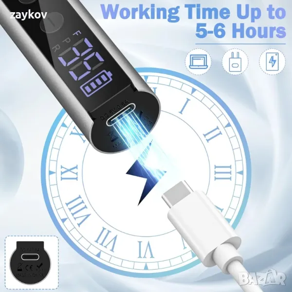 Акумулаторна и безжична пила за нокти: Разполага с батерия с голям капацитет и USB Type-C зареждане, осигуряващи до 5 часа непрекъсната употреба. Перфектен за грижа за ноктите в движение, той осигурява мощна производителност без проблемите с кабелите.
