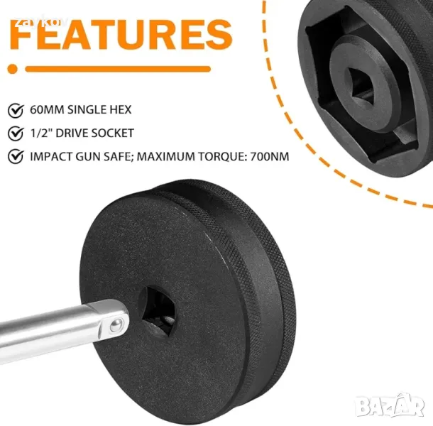 Спецификация】:Включва 60 mm единичен шестограмен плосък специален инструмент; 1/2" гнездо тип D