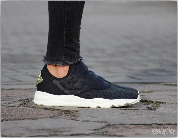 Дамски маратонки Reebok Furylite slip on Leo черни. Спортните маратонки са изборът за активни танци, бягане, степ или кросфит. Изработен от специален синтетичен текстил. Ток с метална закопчалка. Формованата подметка 3D Ultralite е лека и ударопоглъщаща