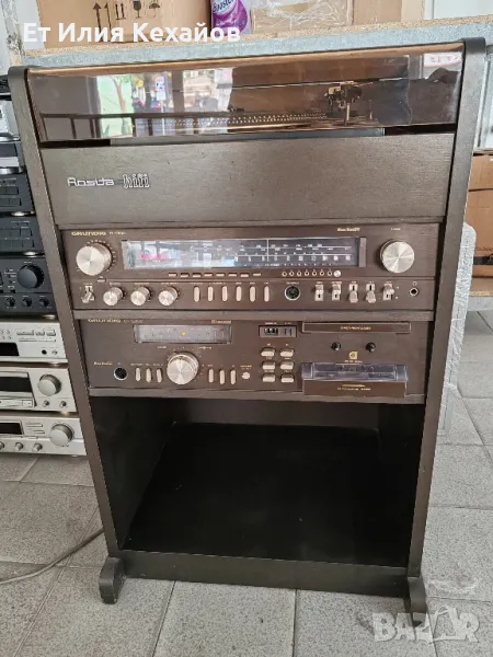 Хайфи рак-музикален шкаф Росита ,прекрасен ,като изпълнение от 1979-1980 година.В комплекта .Хайфи Рак Росита ,Ресийвър Grundig R-1000,Дек Grundig CF-5000.Грамофон Dual 1256,Тонколони Universum .Грамофона работи .Ресивъра работи потенциометъра пращи.Дека свети за смяна на фрикция е или ремъци .Нищо не е отваряно и ремонтирано.Тонколоните работят.Шкафа е в отлично състояние.Продава се само в комплект.