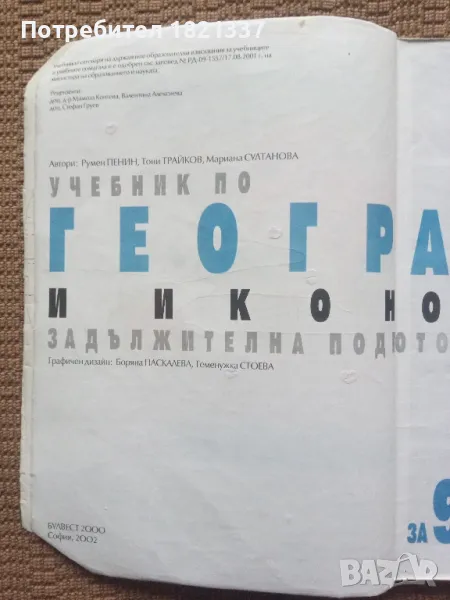 Учебник по география и икономика за 9 клас Задължителна подготовкаАвтори: Румен Пенин, Тони Трайков, Мариана Султанова.Издателство: БУЛВЕСТ 2000. София. 2002 година.