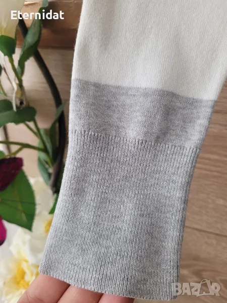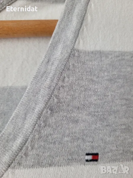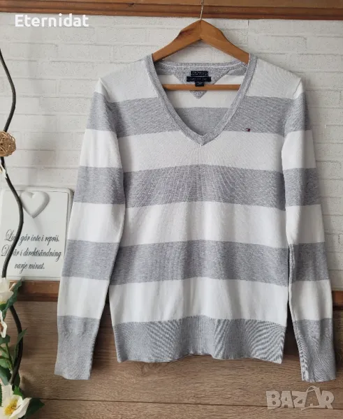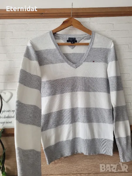 Пуловер бяло и сиво райе на марката TOMMY HILFIGER. Памучна материя, V образно деколте. Размер SРеалната му цена е 229лв.Моята е 80лв