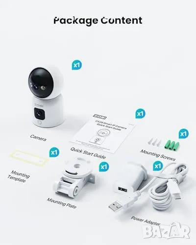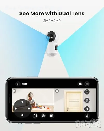 Двоен обектив 2MP+2MP: Горният обектив осигурява 360° хоризонтална и 108° вертикална ротация, а долният предлага панорамен изглед.