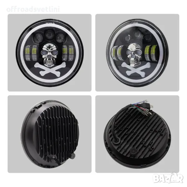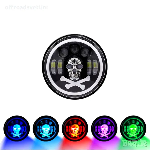 Комплект от 2бр. универсален 7" инча 18см ЛЕД LED фар халоген 12V-24V къси/дълги с DRL дневни светлини мигач бяло-жълто и череп с RGB подсветка с 6 различни цвята за АТВ джип мотоциклет камион трактор и др.