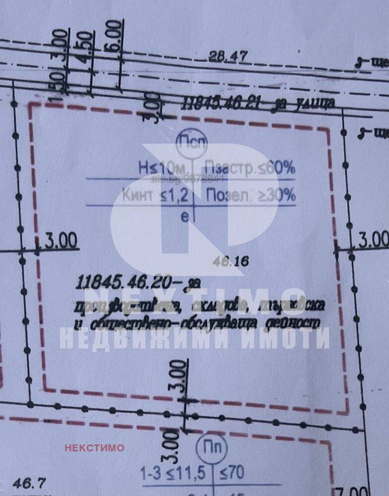 Агенция за недвижими имоти има удоволствието да Ви представи идеална възможност за развиване на Вашия бизнес. Представяме Ви парцел с НТП за производствена, складова, търговска и обществено-обсл. дейност. Парцела е с перфектна квадратна форма с лице 65кв.м. Параметри на застояване КИНТ 1,2, H до 10м, Плътност на застрояване е до 60%, Плътност на озеленяване до 30%. Ако си търсите място, където да построите Вашия бизнес, това е иделеният имот за Вас. Агенцията е с ЕКСКЛУЗИВНИ права!