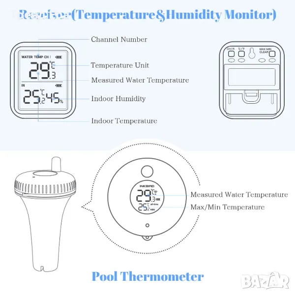БЕЗЖИЧНА ВРЪЗКА 300 ФУТА С еднопосочния конектор, подобрена технология, е много по-лесно безжично да свържете термометъра за открит басейн към монитора на приемника. Можете да проверите показанията на температурата с приемника, без да излизате извън стаята.