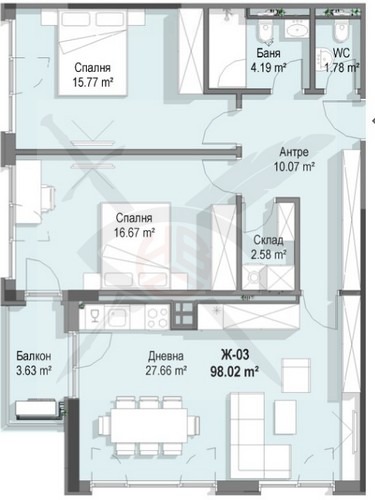 РАЗПРЕДЕЛЕНИЕ: Имотът разполага с площ от 115 кв.м., разпределена във входно антре, дневна с трапезария и кухненски бокс, две спални, баня с тоалетна, самостоятелна тоалетна, склад и тераса.