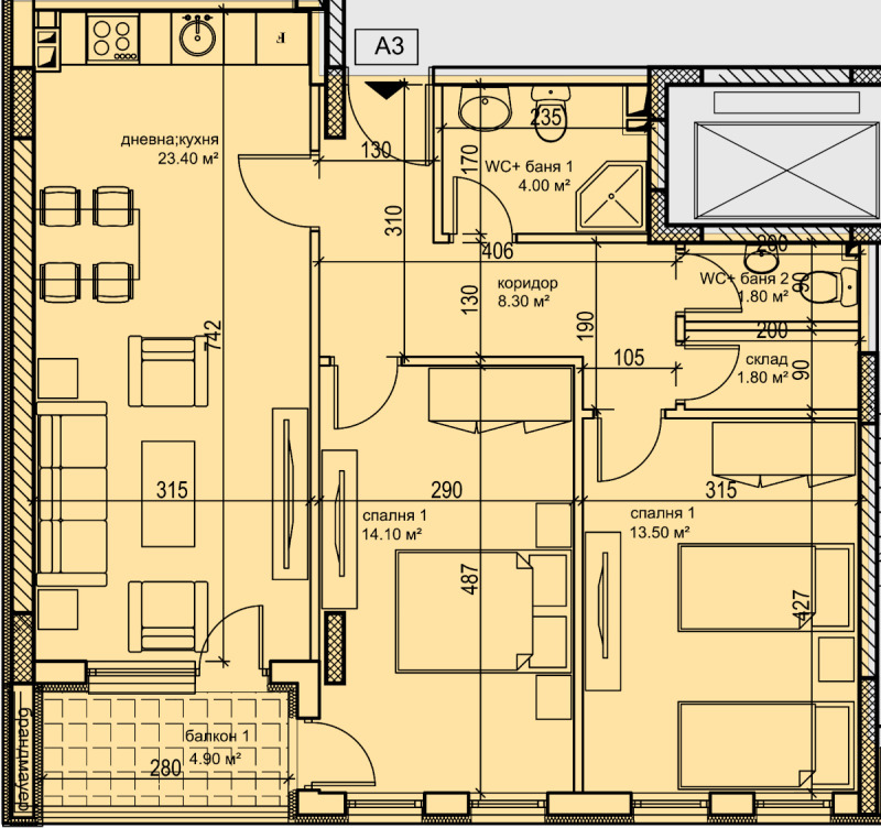 Тристаен апартамент в нов комплекс до моста на ВИХВП, в непосредствена близост до два големи супермаркета, близо до училища, детски градини, ясли и автобусни спирки. 83 кв.м. чиста площ, южно изложение, две спални, две бани, една тераса. Пред Акт 16. Предлагат се подземни паркоместа по 25000 евро.