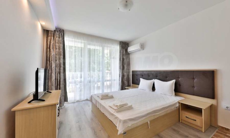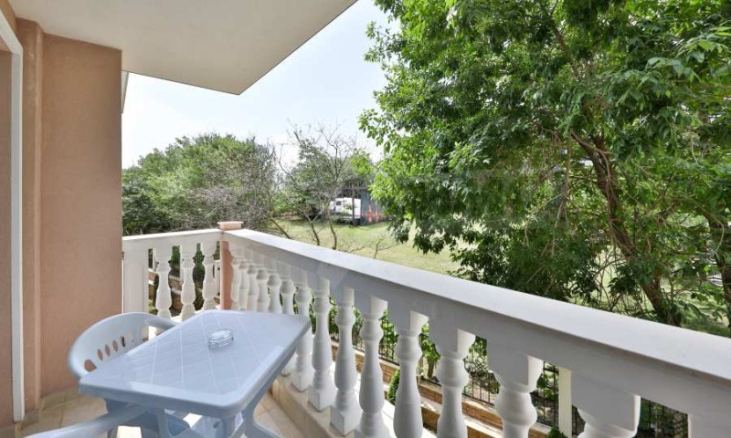Апартаментът има просторна тераса с красива гледка към зеленината на курорта.