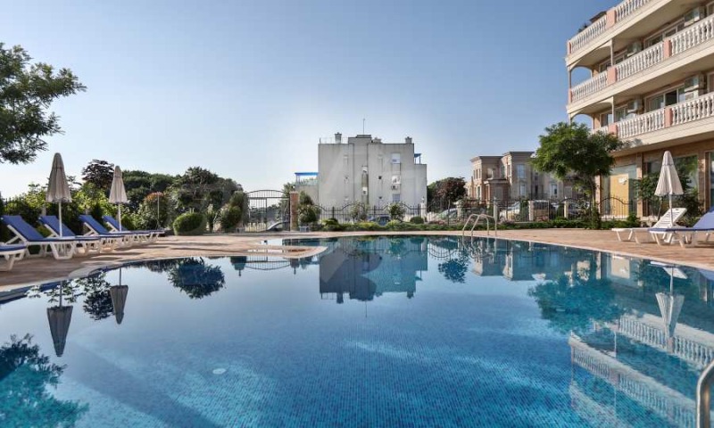 Сградата се откроява с изискана и елегантна архитектура, с просторни тераси с балюстри. Ориентирана е към морския бряг и предлага невероятни гледки към морето и плажа. Има всички необходими за приятната почивка удобства на територията: басейн, подземен паркинг и ресторант, охрана, видеонаблюдение и рецепция.