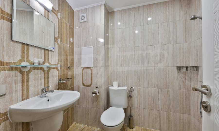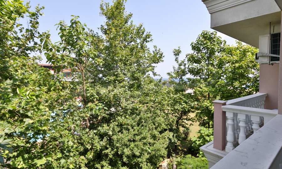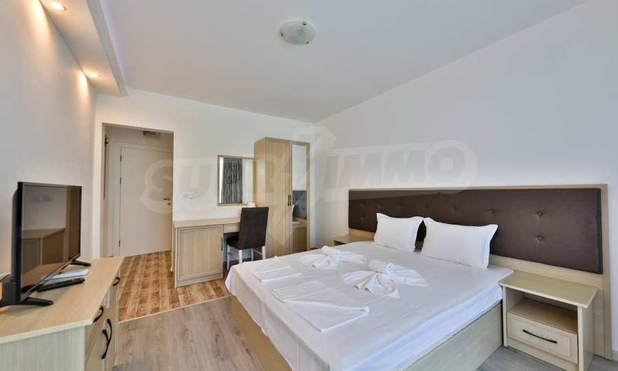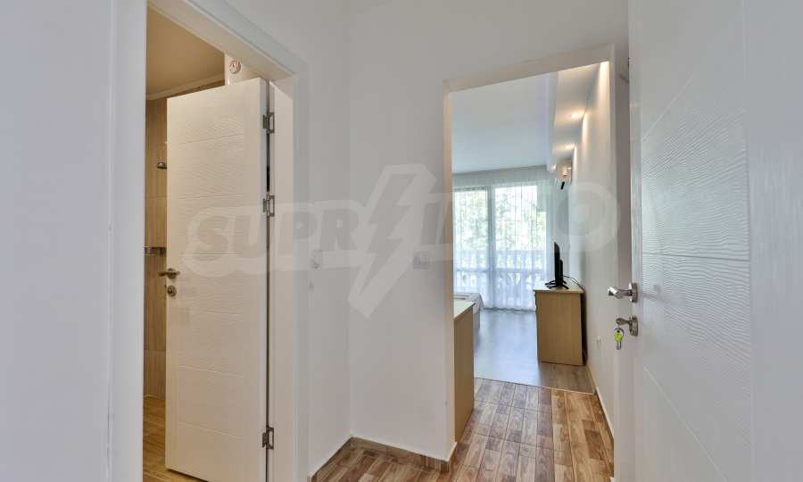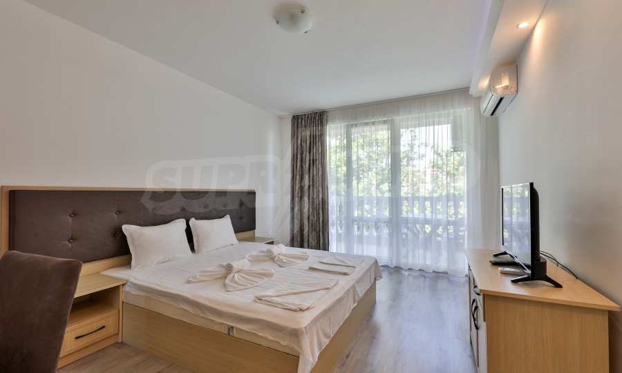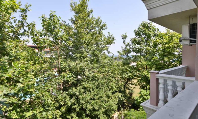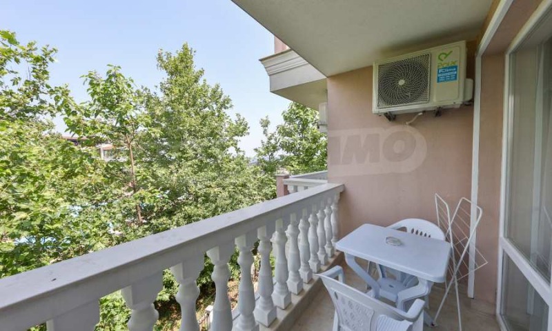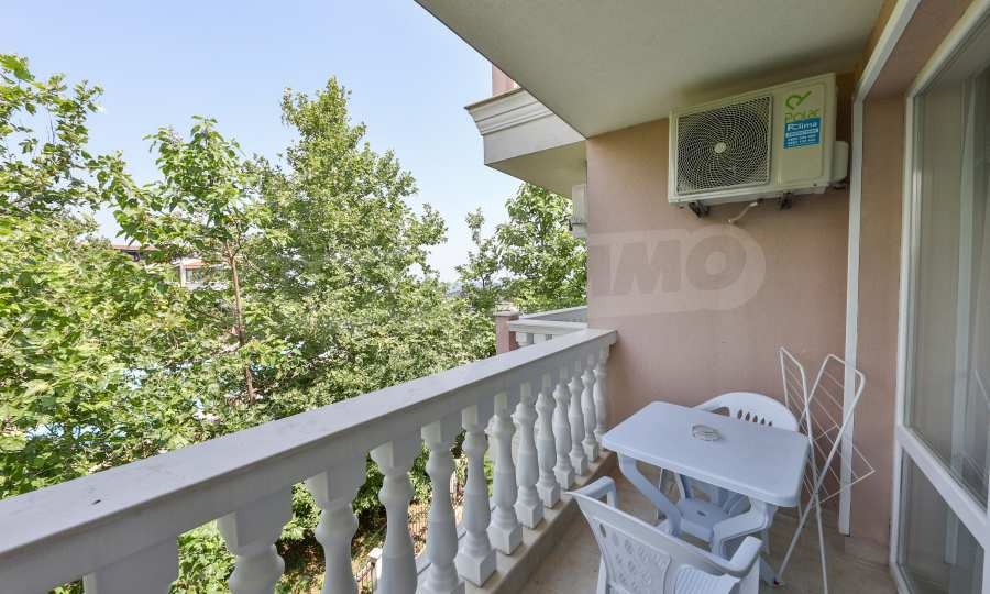 Апартаментът има просторна тераса с красива гледка към зеленината на курорта и морето.