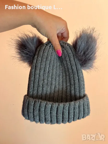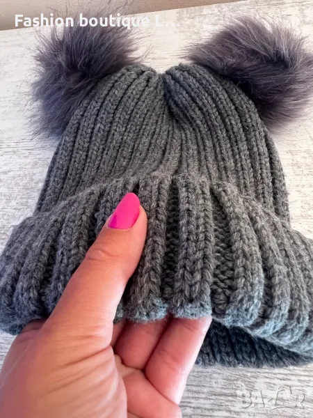 Сива пухена плетена шапка с два помпона от еко косъм 🩶 → Обява 47854286