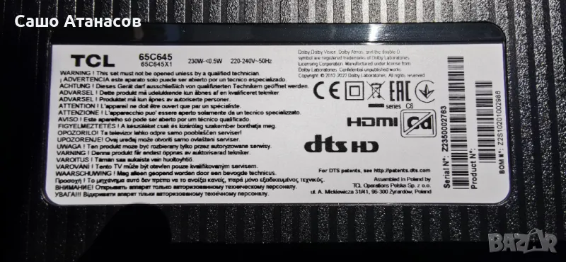 TCL 65C645X1 със счупена матрица, 40-L30XW4-PWB1ZG, 40-R51MPL-MAA2HG, WKCT26M2501, 65HR330M11A4 V1