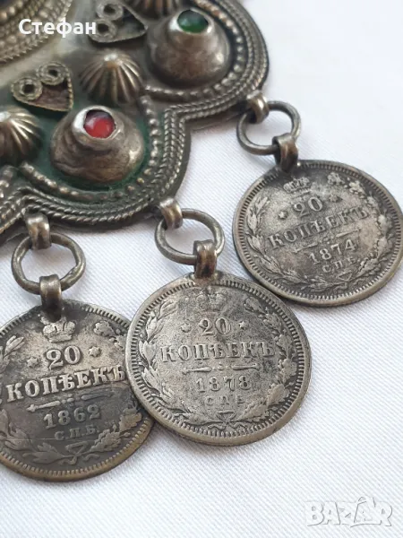 Стар сребърен накит с монети и диаметър - 9 см, ниска проба сребро - 500/1000, тегло - 87.63 грама, 100% автентичен, копейките са сребурни и автентични.