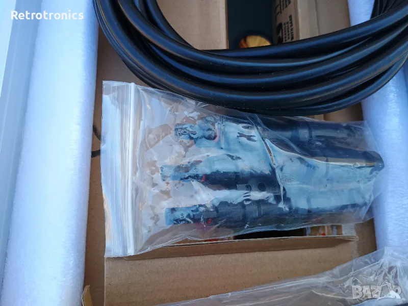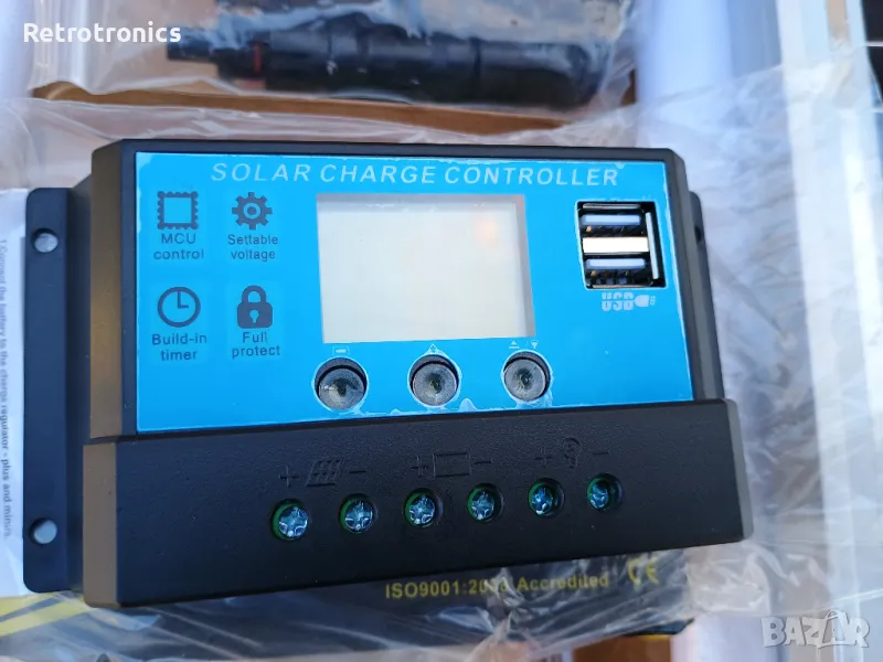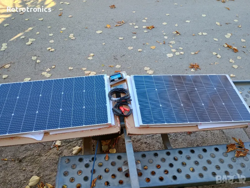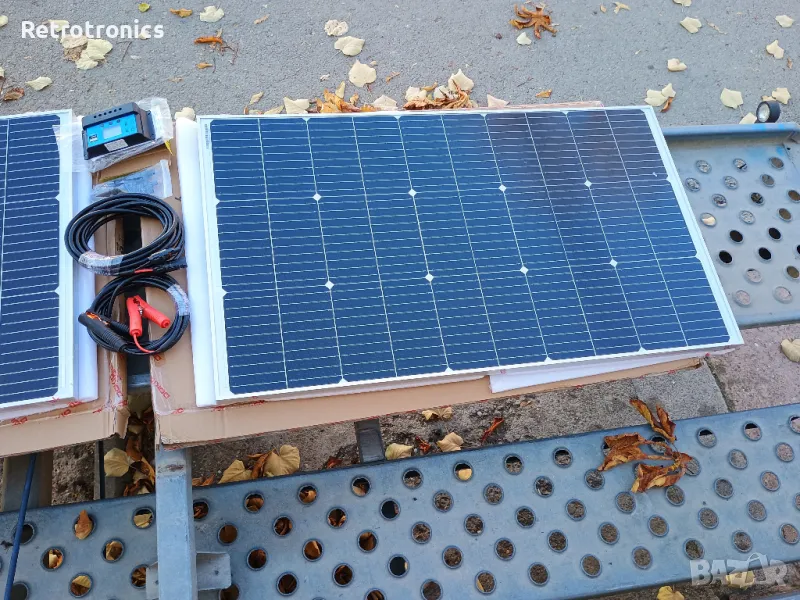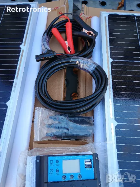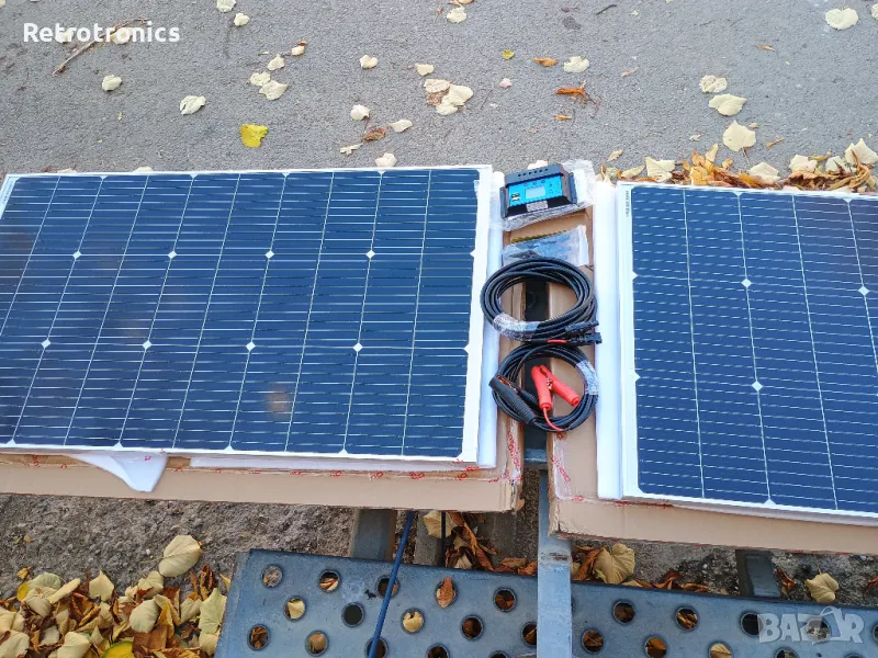 Продавам монокристален (solar panel) соларен панел кит преносим, 200 W, IP67. Два панела с алуминиеви рамки по 100W на 18 волта, контролер 20 ампера, конектори, кабели за акумулатор 3 метра и кабели от панела до контролера 5 метра. Коефициент 22, 23 %. Размер на панелите 56 см. на 97 см. Ново отворено само за снимки.