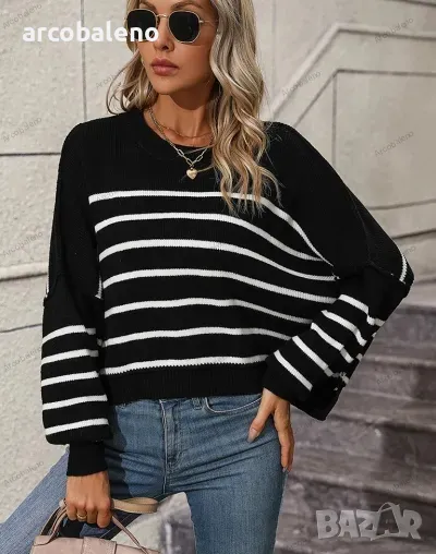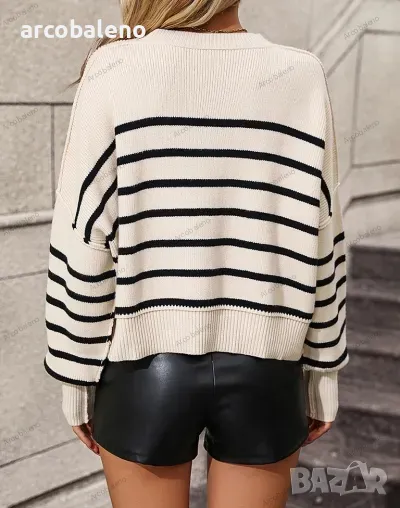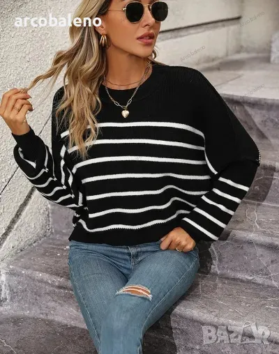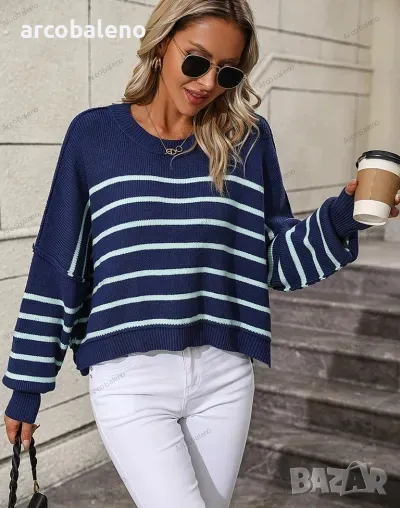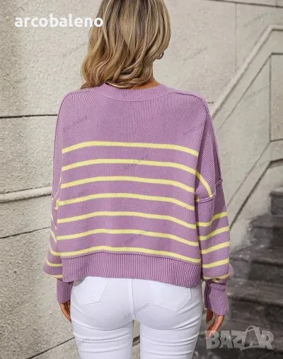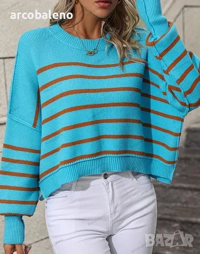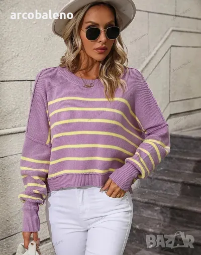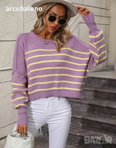 Дамски плетен пуловер с кръгло деколте, свободен пуловер на райета, 5цвята