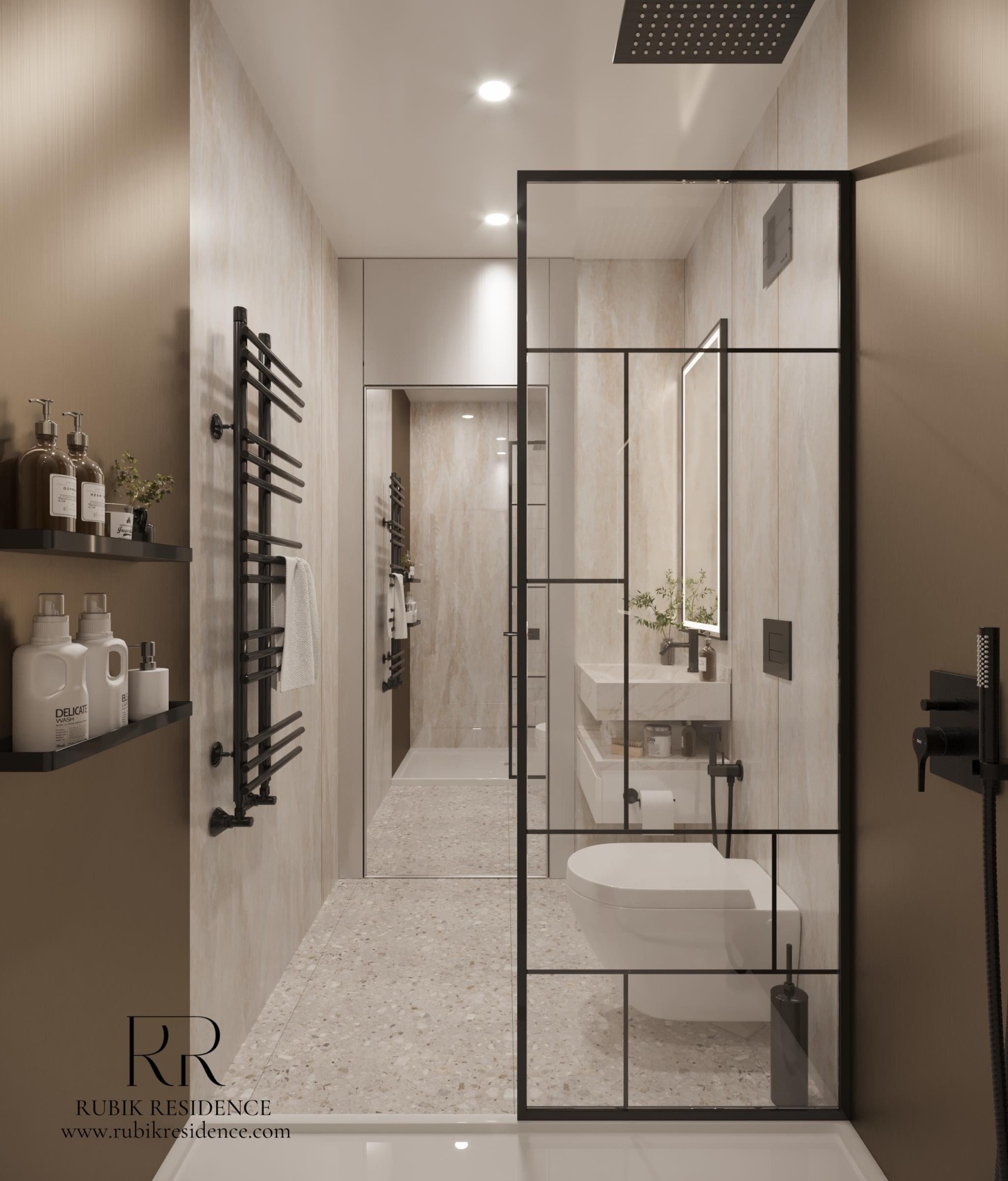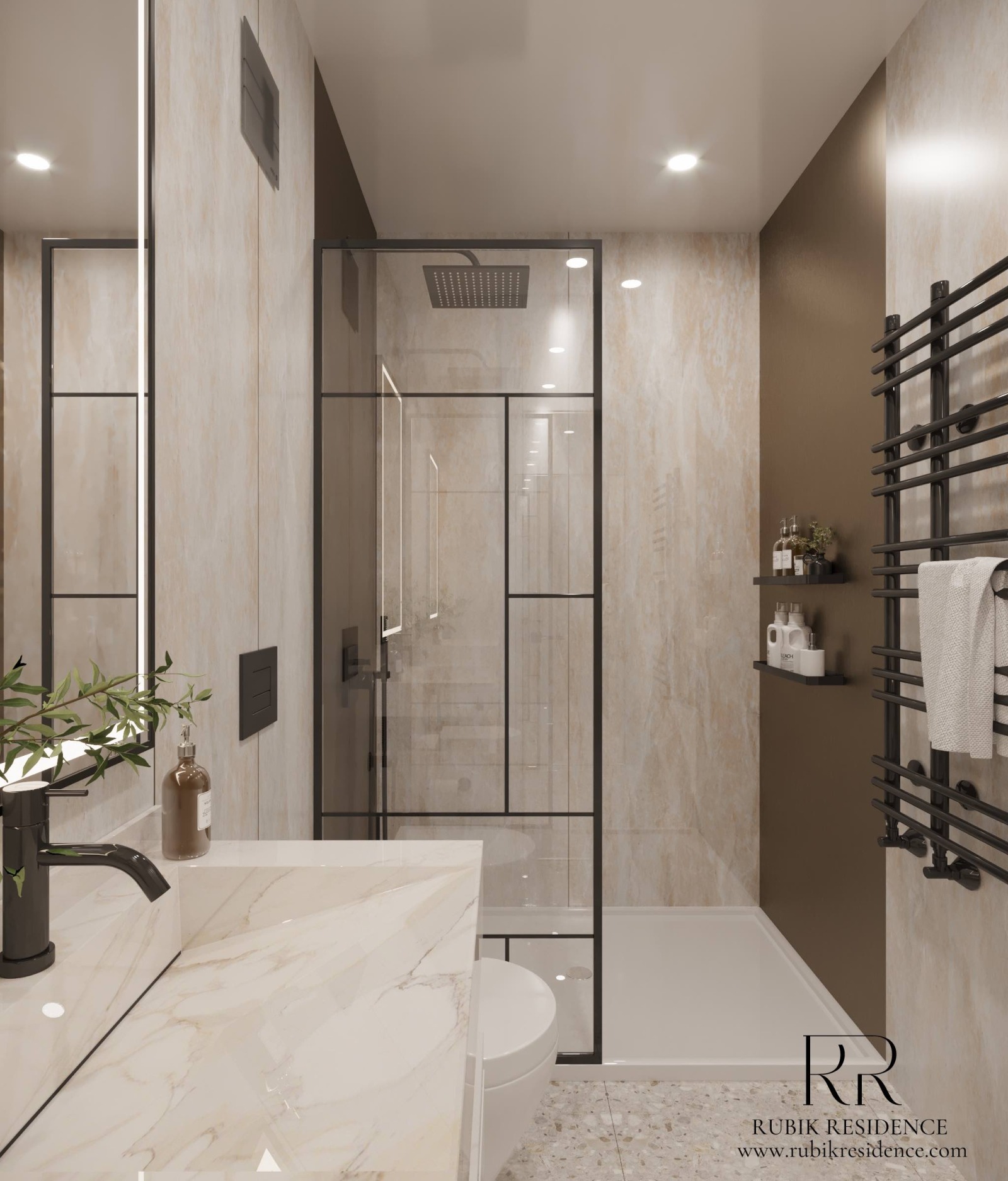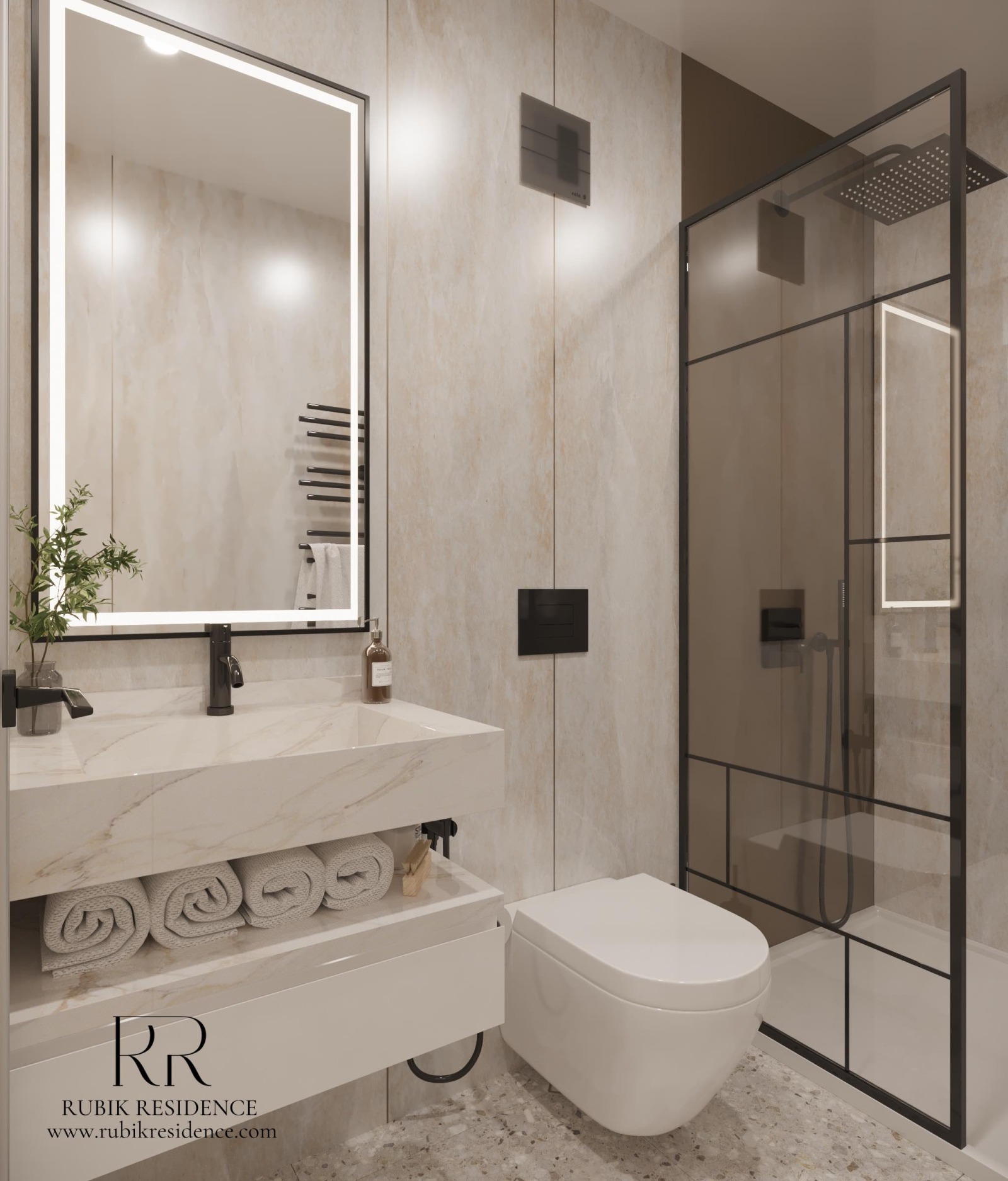 Баните са изработени от мрамор и драскан метал, които създават луксозна и модерна атмосфера. Оборудването на баните включва мивка, огледало, параван, душ корито, смесител и вградена структура. Мивката е вградена в шкаф с плот от мрамор, който осигурява пространство за съхранение. Огледалото е с вградено осветление. Параванът е от стъкло и метал, който разделя мократа зона от останалата част на банята. Дизайнът на баните е елегантен и функционален, като предлага комфорт и качество.
