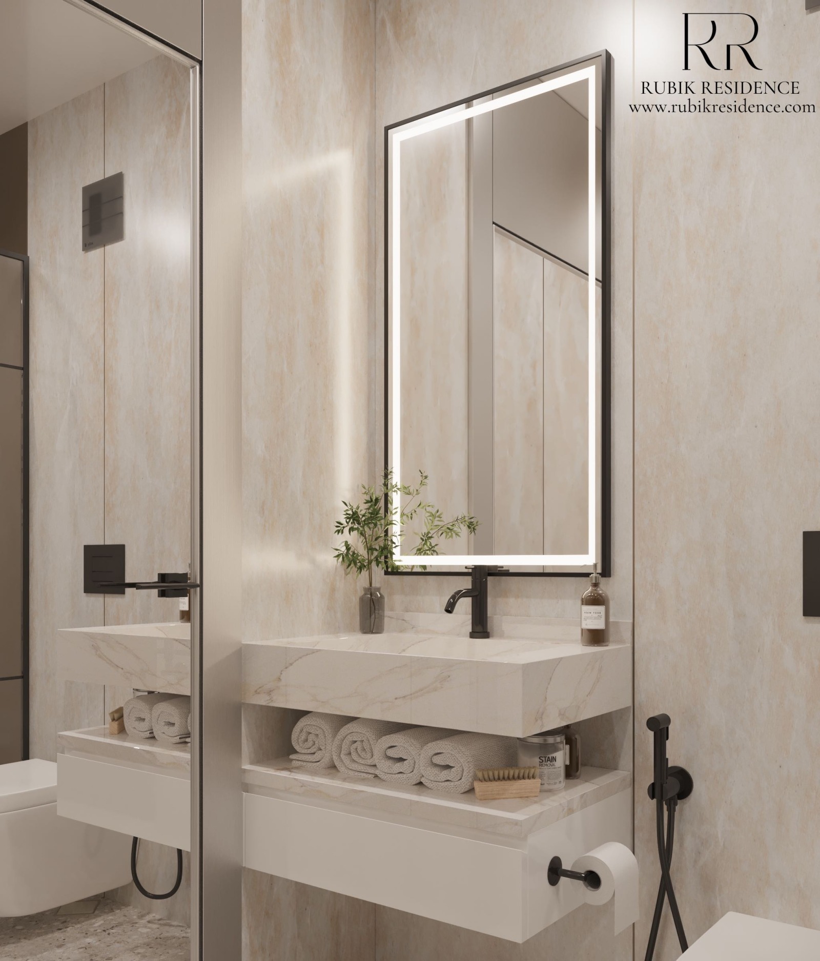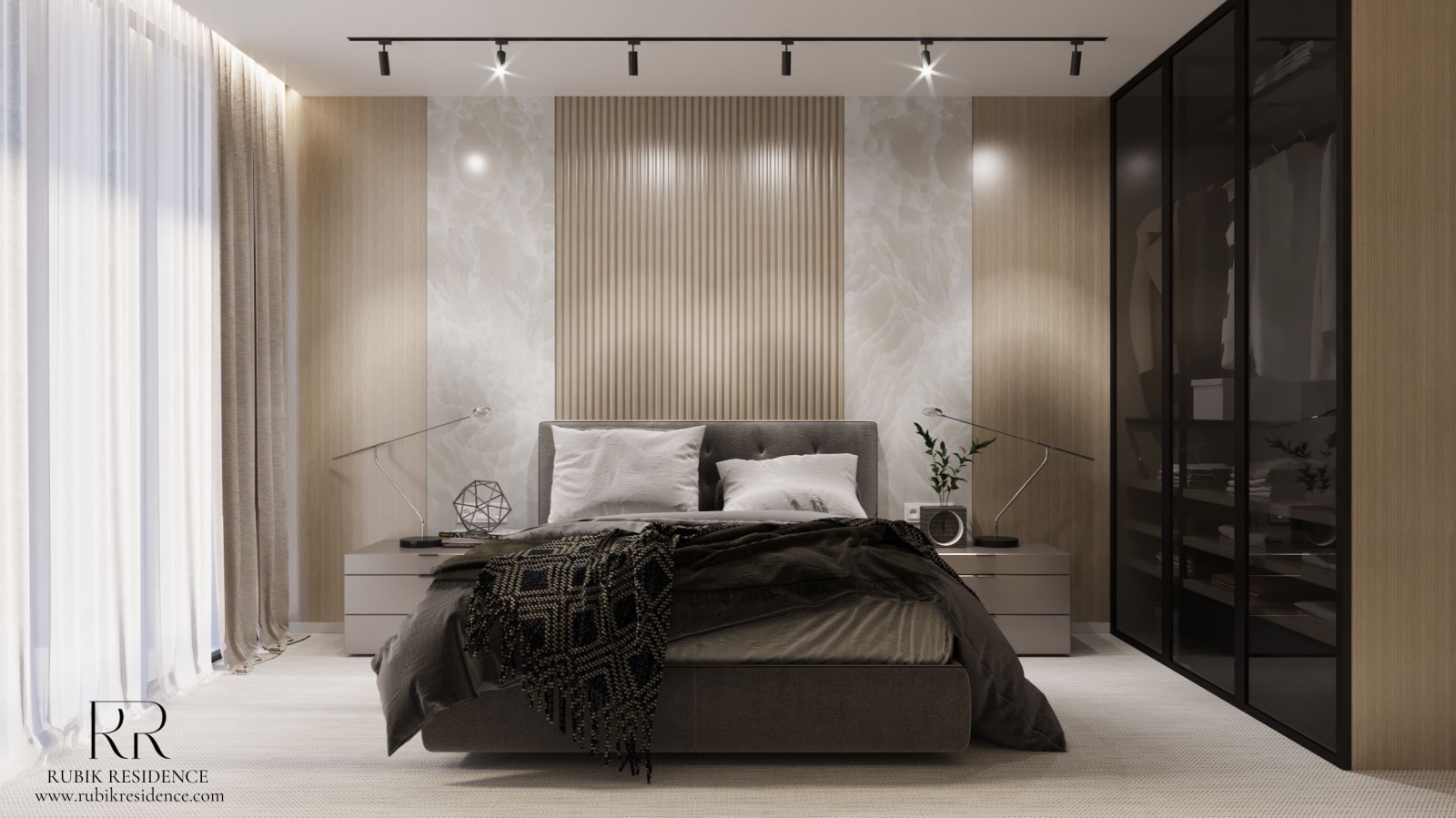 Спалните са обзаведени в изискан дизайн, който включва елементи от мрамор и дърво. Красивата комбинация от нежния мрамор и топлата текстура на дървото придава на пространството изтънченост и уют. Подовата настилка, изработена от нетъкан текстил, придава мекота и комфорт, допълнително засилвайки усещането за уют в спалнята.