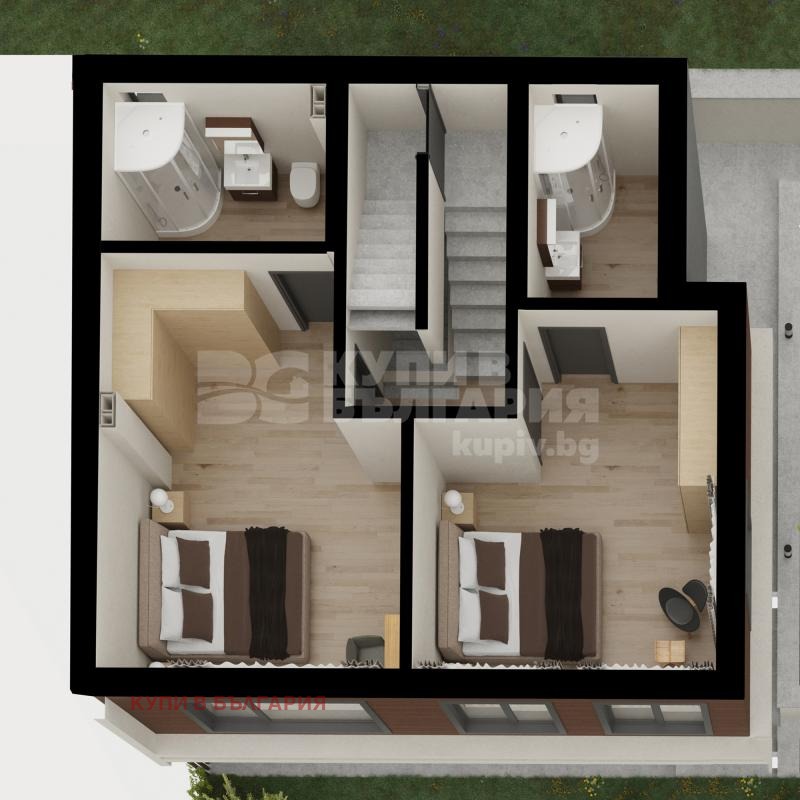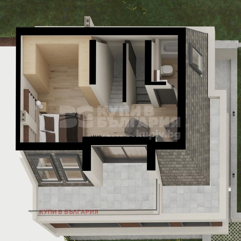 Разпределение: на първият етаж има дневен тракт с кухненски бокс и трапезария, тоалет с перално помещение, голяма веранда и стълбище към горния етаж. На вторият етаж има разположени две спални, всяка със собствена баня и тоалетна стълбище към горния етаж. На третият етаж има огромна спалня със собствена баня и тоалетна и голяма тераса.