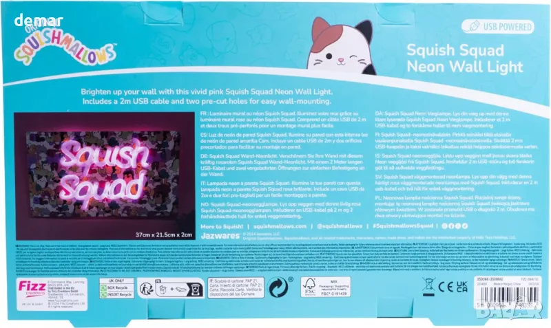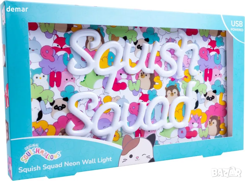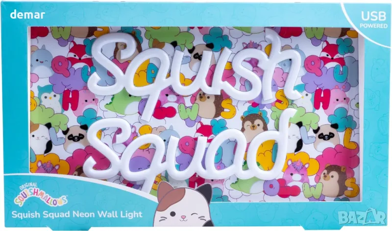 Неоновата стенна лампа Squish Squad е жив, официално лицензиран аксесоар за феновете на Squishmallows, включващ поразителен розов неонов ефект. Проектиран за окачване на стена, той се предлага с предварително подготвени отвори за лесен монтаж. Тази лампа, захранвана от USB, включва 2 м USB-A захранващ кабел с прозрачно покритие за дискретно поставяне. С размери 37 см x 21,5 см, той е с перфектни размери както за стенен дисплей, така и за поставяне на бюро.