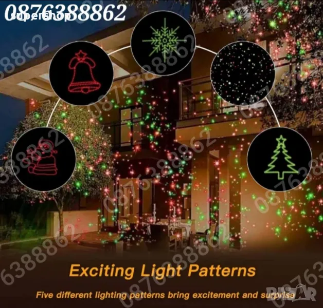 Лазерните коледни външни светлини са направени от добри лазерни компоненти, което прави ъгъла на прожектиране по-голям, дисплея на шаблона по-ясен и по-равномерен, а ефектът на декорация е страхотен, ефектът на декорация на движещи се червени и зелени Звезди, Камбанки, Елха, Подарък и Снежен Човек, ще ви върне детската мечта, която е подходяща за Коледа.