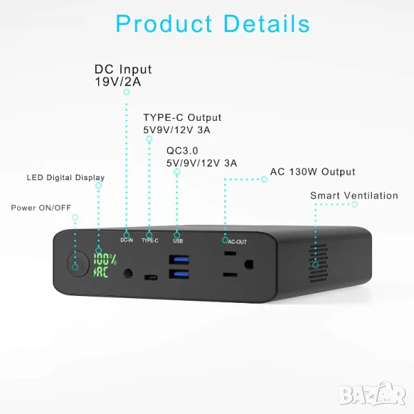 220 V/130 W (макс.). AC контактът осигурява добро решение за захранване с променлив ток. Съвместим с голямо разнообразие от лаптопи, телефони, телевизори, принтери, вентилатори, лампи, мини хладилници и други AC устройства (по-малко от 130 W). Предлага се с 2 USB порта (поддържа бързо зареждане 3.0) за вашите малки устройства като телефон, цифров фотоапарат и 1 TYPE C порт (5V/9V/12V) за USB-C устройства като Nintendo Switch, MacBook 12''. 4 устройства могат да се зареждат едновременно.