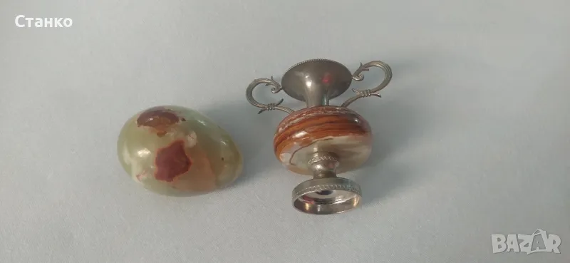 Яйце и делвичка направени ръчно със полускъпоценен камък. Мисля че е "майфон" или "оникс". Цената е за двете.